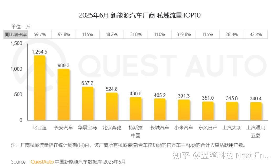 2025年汽车用户已经全面进入智能化,不仅追求智能驾驶,更期待智能生活。QuestAuto 数据显示,截止6月,新能源汽车厂商私域流量快速增长,反映出用户对智能化服务的需求增加以及品牌粘性的提升。