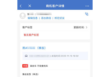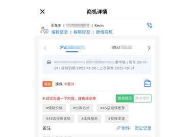 1)根据保险到期时间自动生成续保商机,并由分配的顾问进行跟进; 2)根据企微群的事故车消息,自动生成事故车商机,由值班的顾问主动联系,并持续跟进; 3)无效等处理改成“流失等处理”。