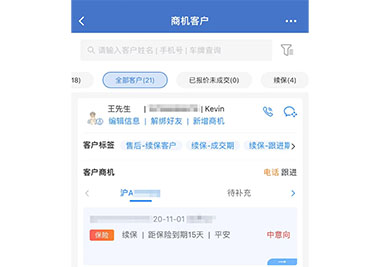 1)根据保险到期时间生成阶段标签,提醒顾问联系客户续保;2)根据事故信息自动生成事故车任务,事故专员领取任务,主动推荐客户维修服务;3)在客户生日或购车纪念日,提醒顾问进行客户关爱,提高客户粘性和回店率。