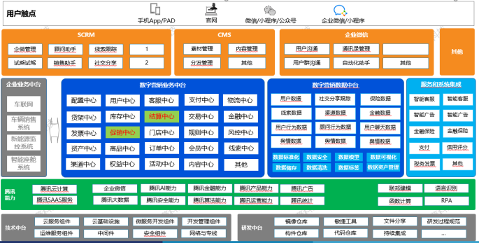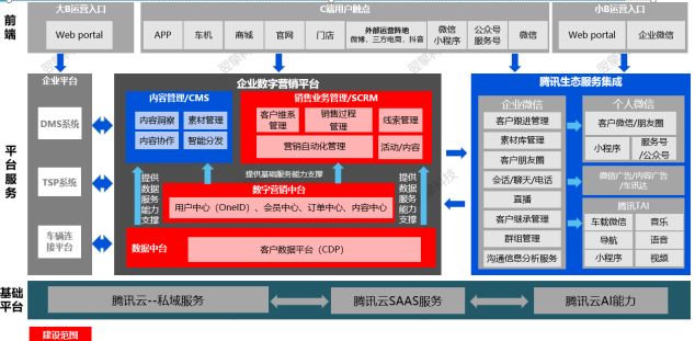 1)与腾讯生态CDP系统进行对接,支持对线索进行全网评级;以用户为中心,数据为决策体系,构建线下线上全流程闭环体系; 2)符合企业数字化转型需求,帮助车企应对快速变化的营销需求,具备开放、高扩展性、高稳定等特征。