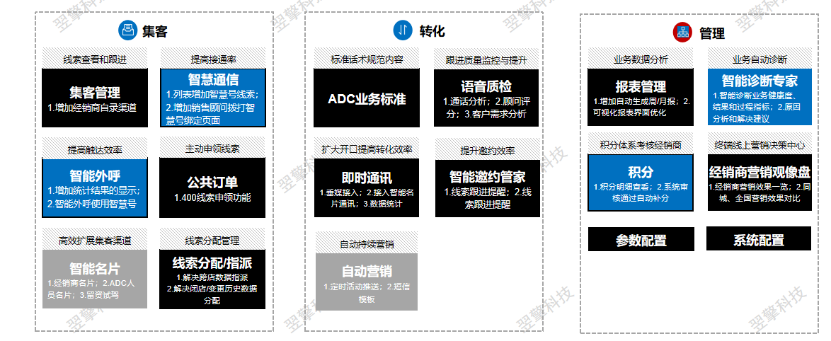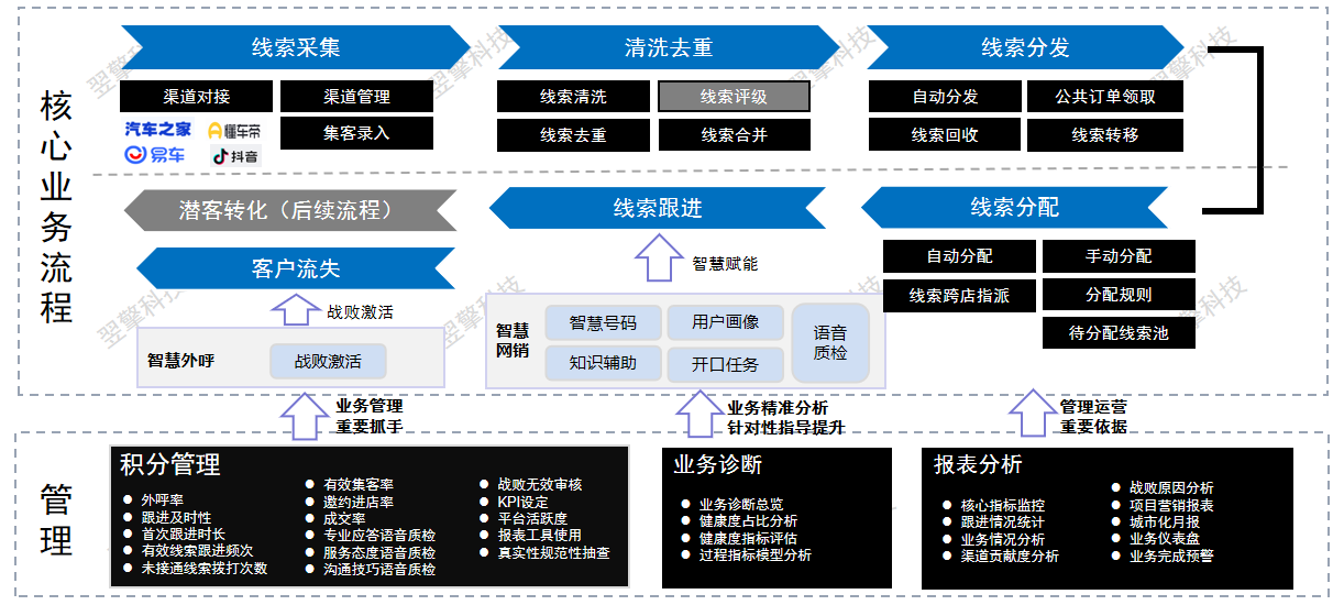 C端客户多渠道留资,线索分散,管理效率低;经销商考核标准单一,缺乏综合全面的考核体系。
