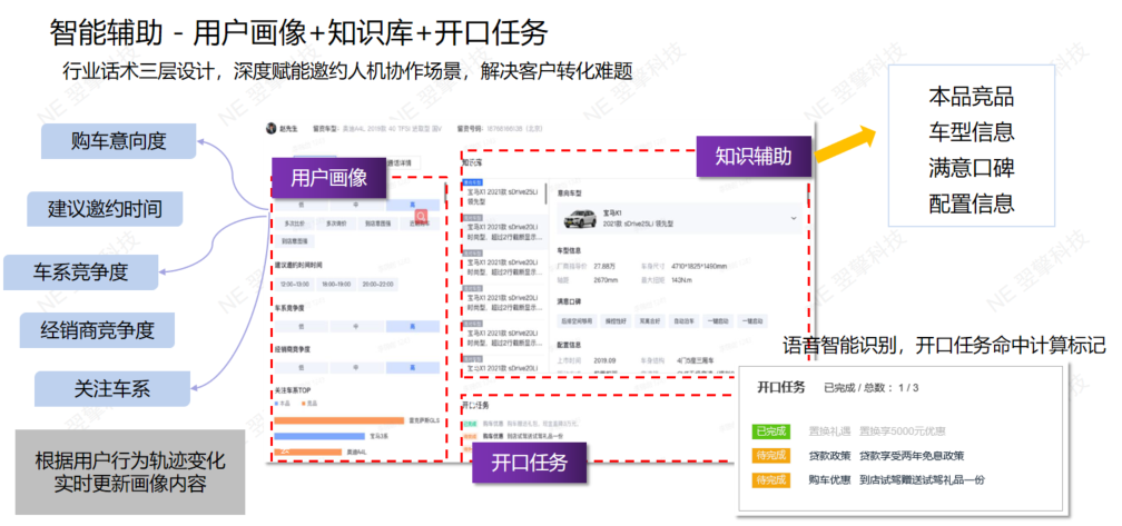 避免邀约专员真实工作号码外漏,被标记和拉黑;用座机邀约,客户端显示正常经销商所在地手机号,提高接起率;通话过程可记录、可回放,提升过程管理;通话过程语义分析,实现邀约专员能力评估和指导。