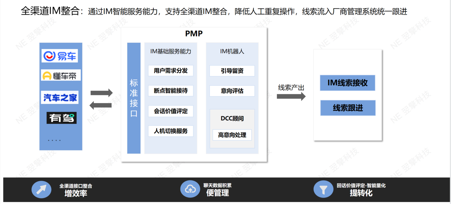 通过IM智能服务能力,支持全渠道IM整合,降低人工重复操作成本,线索流入线索中心统一跟进,提高客户邀约效率和响应效率。