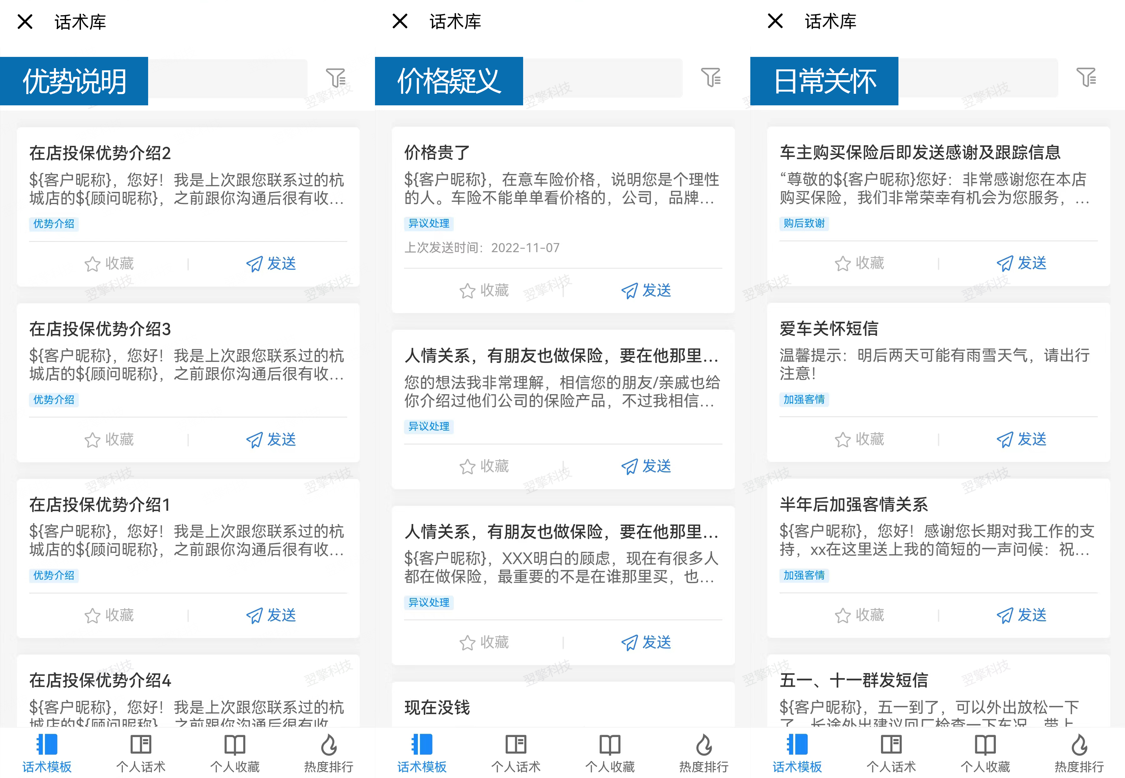 3)话术库提供专业话术模版和自定义个人话术,同时还支持话术排行榜,顾问可参考专业高频话术,快速切换,灵活使用。