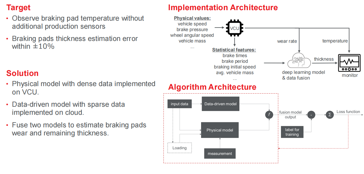 基于“物理模型+数据驱动模型”融合,使用VCU密集数据和云端稀疏数据,结合深度学习模型,预估刹车片剩余厚度,计算磨损率,实现短期预警和长期预测,确保行车安全;推动企业构建预测性维护,提升维保质量。