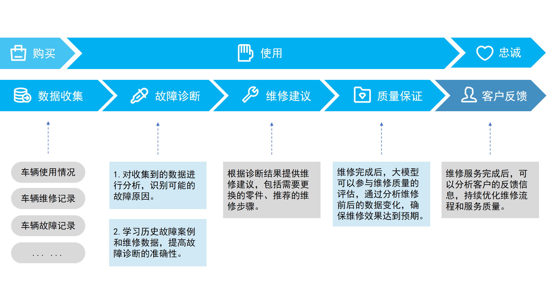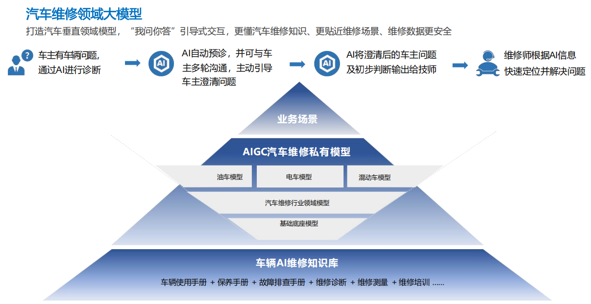 据中汽协会报告分析,未来体验类、智能化等高增长、高溢价业务将是中国汽车后市场的发展重点。在汽车维修领域,随着大数据、AI大模型等新技术对行业的加速变革,未来有望将从当前的AI故障识别,进一步实现智能化升级。