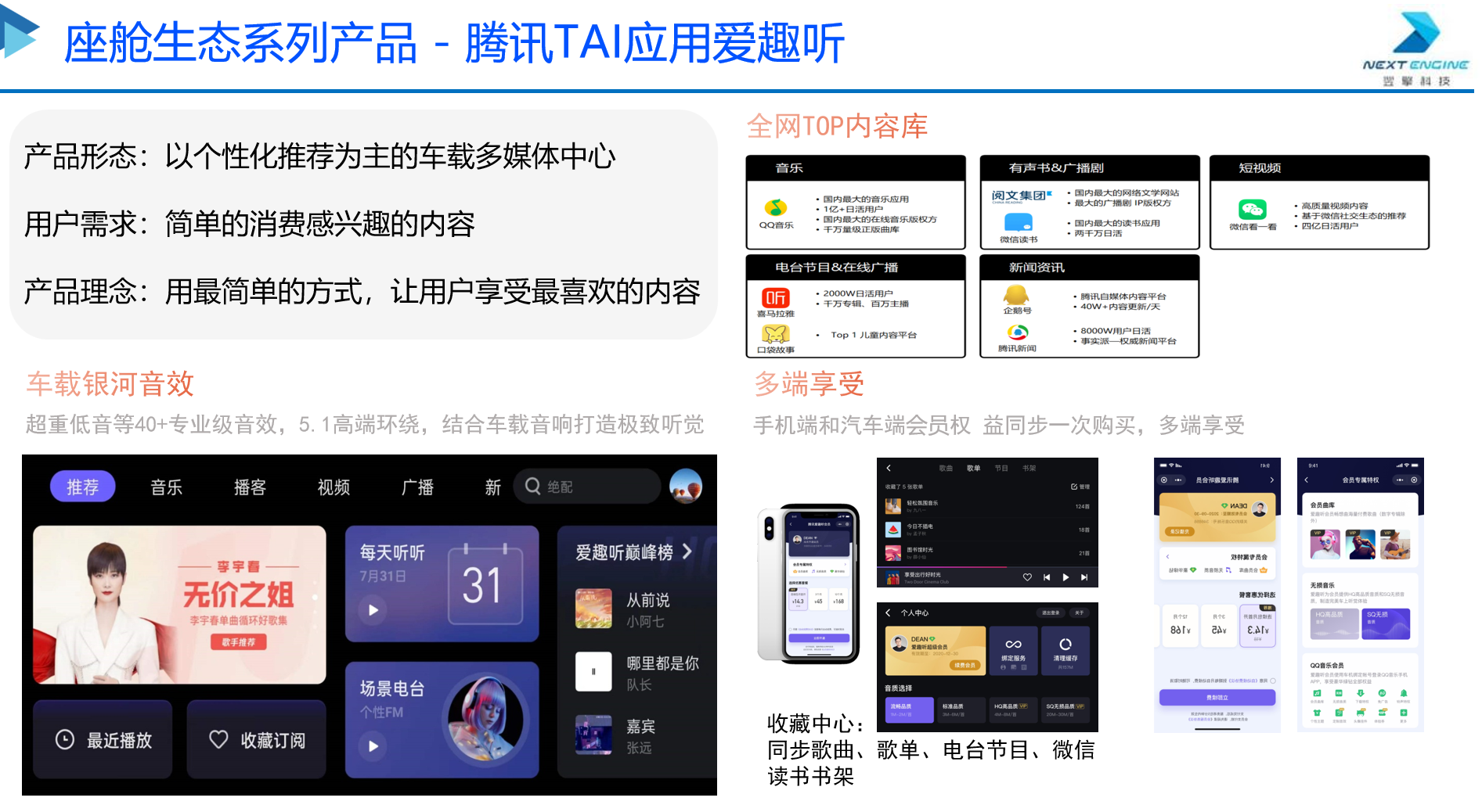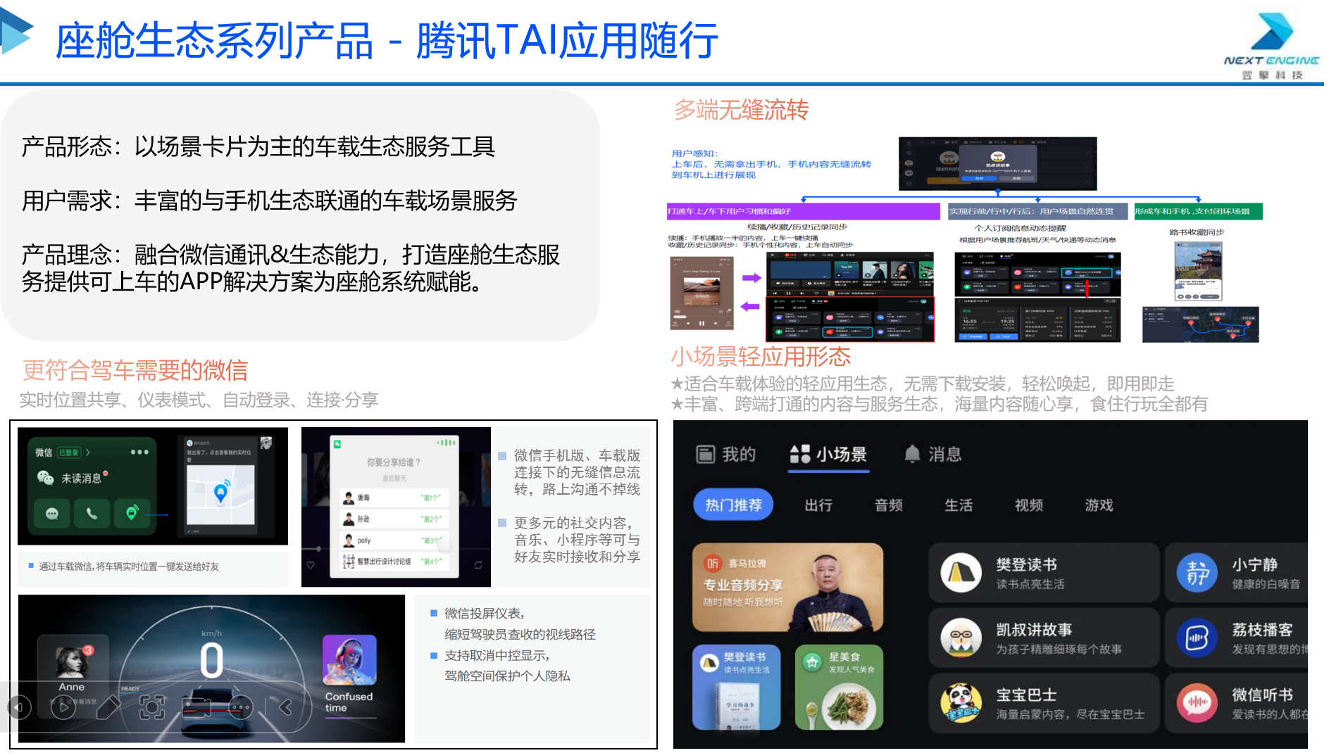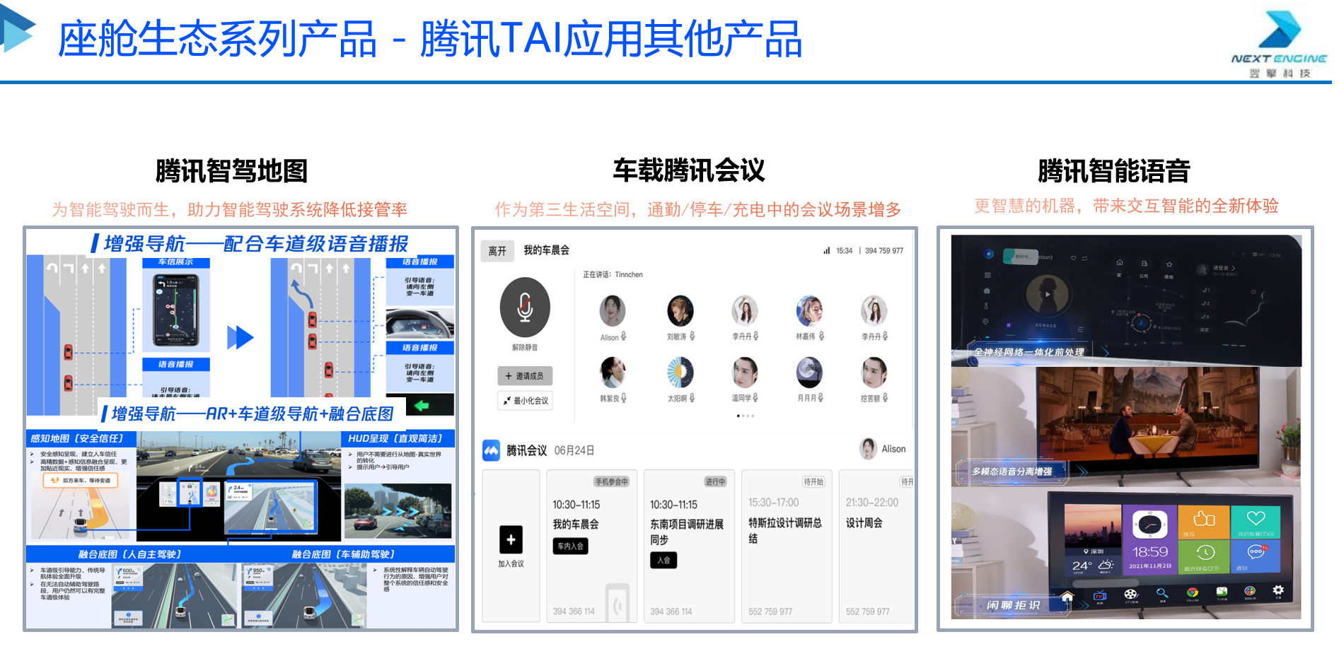 基于腾讯优势的内容和服务生态,结合微信的连接能力,提供全场景智能车载服务。包含应用:爱趣听、腾讯随行、腾讯智驾地图、车载腾讯会议、腾讯智能语音。