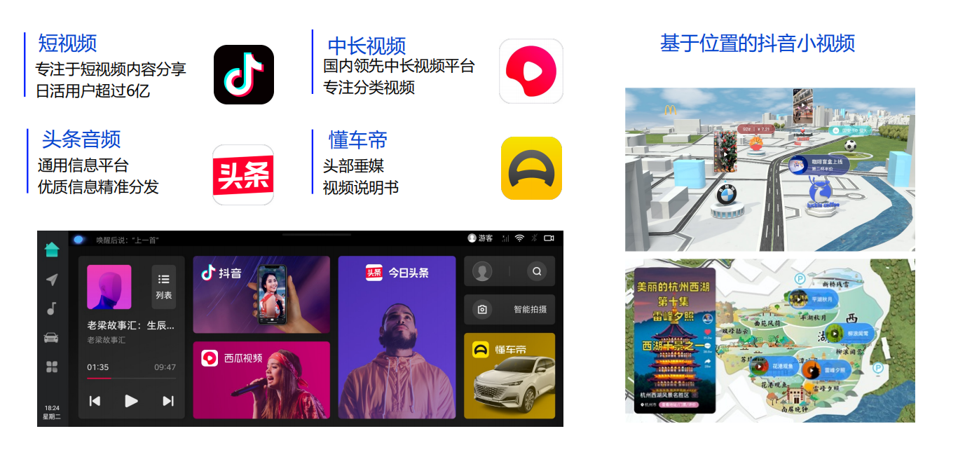 沉浸式、混合音视频产品,将抖音短视频、西瓜视频、头条音频等内容与字节智能推荐技术相结合,智能拍摄抖音分享,构建车载场景下的娱乐内容和服务体系。