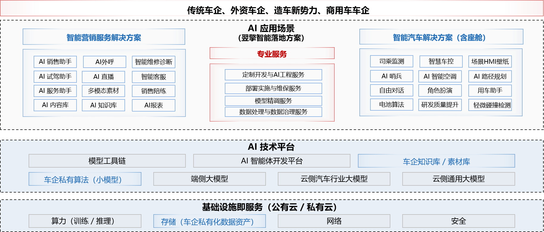 融合大数据、车联网、AI大模型等技术,基于汽车工程领域沉淀的知识库,深入学习行业know-how,构建AI垂直模型,在车辆诊断、车辆维修、金融保险、二手车估值等领域实现智能化服务。